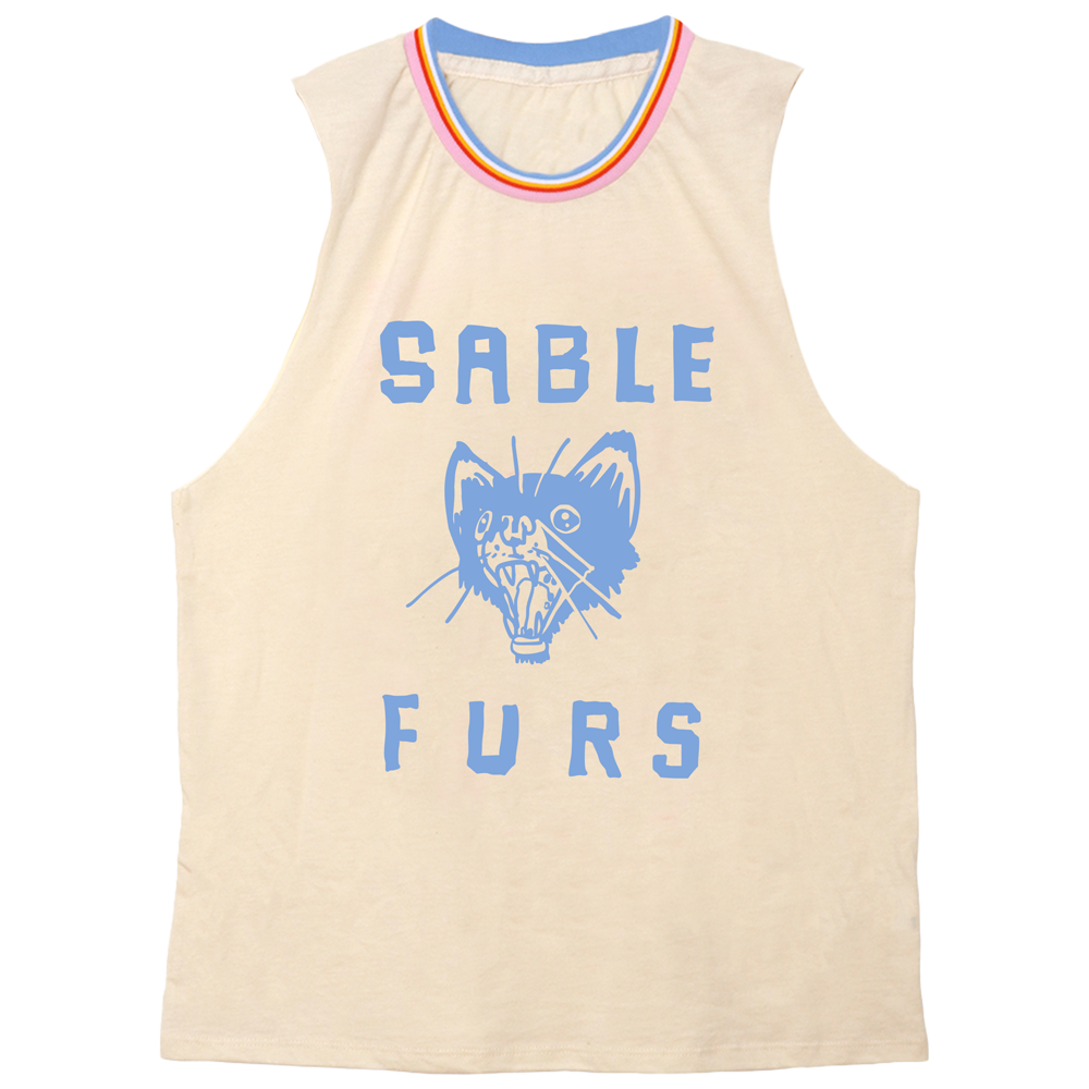 Cream muscle tank with stripe trim neckband and raw edge armholes and the Fangs Moto design printed on the front